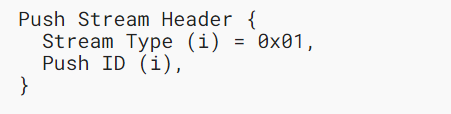 PUSH ID:一个可变长度的整数,用于标识服务器推送操作。Push ID用于push stream标头和CANCEL_PUSH帧。