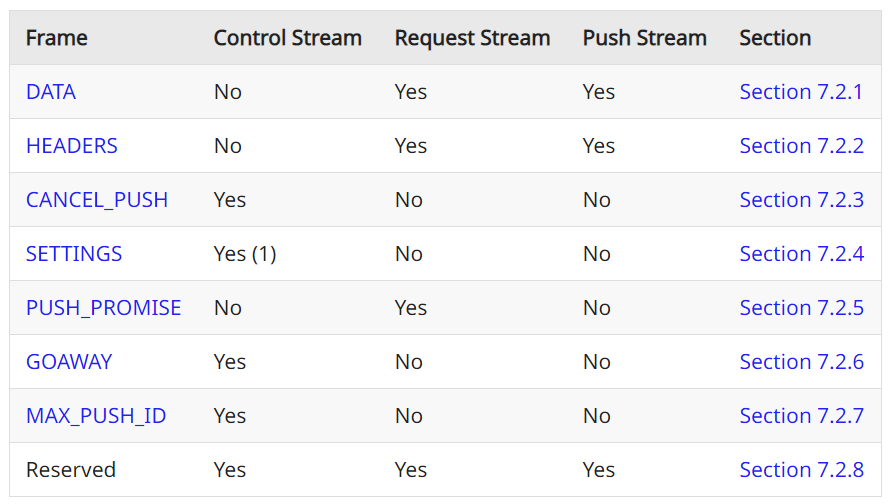 SETTINGS帧只能作为控制流的第一帧出现,从表1(1)中可以看出。请注意,与QUIC帧不同,HTTP/3帧可以跨越多个数据包。