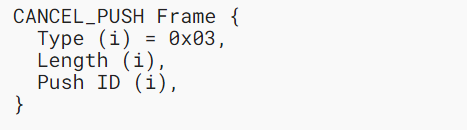 CANCEL_PUSH 帧(类型=0x03)用于在接收push stream之前请求取消服务器推送。CANCEL_PUSH 帧通过推送 ID(参见第 4.6 节)标识服务器推送,编码为可变长度整数。