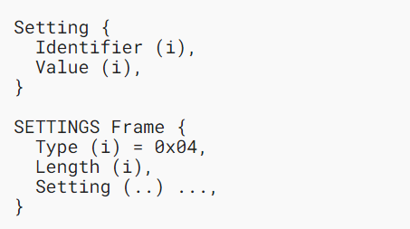 SETTINGS 帧 (type=0x04) 传递影响终端通信方式的配置参数,例如对对等行为的偏好和约束。单独地,一个 SETTINGS 参数也可以称为"setting";每个SETTINGS参数的标识和值可以称为“设置标识”和“设置值”。