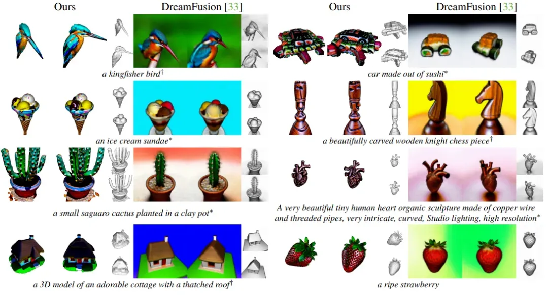Magic3D(第 1、3 列)与 DreamFusion(第 2、4 列)对比