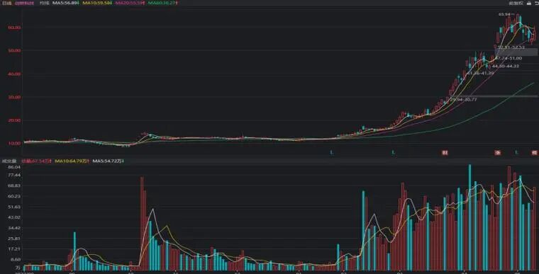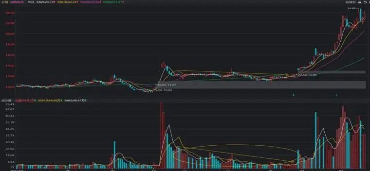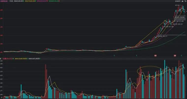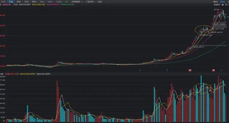 出货:看上图,两个圆圈处这里可以理解为主力庄家开始出货,特征,成交量绿肥红瘦并放阶段天量,和之前反过来了。那是不是所有的出货都是绿肥红瘦呢?不是的。主力资金是可以影响几个交易日的收盘日K线的红绿的。只需要记住,高位放巨量一定是筹码松动的迹象,一定是股价要发生转折的前兆。这里需要说明的是,是不是出了巨量就不能涨了,答案是否定的,剑桥也新高了,这里可以理解为主力资金出货是一个过程,并不是几个交易日就能完成的。也可以理解为原来的主力资金撤离了,新的短线资金入场。无论是哪种情况,你都需要明白的是。股价高了就是原罪,就是下跌最大的风险,就可以了。如果继续博弈,那就是风险偏好和仓位管控以及操作风格的问题了。还有一点是非常重要的,并不是所有的主力资金出货都是高位放巨量,会有一小部分是温和放量的,甚至比主升期是缩量的,这个怎么理解?第一、因为受到市场环境等的影响,主力资金没有顺利出货,导致利润大幅度回撤,只能一点一点的出货。第二、主力手法问题,在放量拉升的过程中已经在慢慢出货了,在高位已经没有多少筹码了。那我们怎么应对呢?这就要用到论术说的多维度考虑买卖点的问题。在高位,比如04.18或者04.19日高位介入剑桥科技,那么当股价跌破5日线的时候你肯定要离场了。如果有朋友问,04.27日跌停,我卖亏了,第二天反包还新高了。那论术只能说你是在事后诸葛亮,如果完全按照《从零教你炒股票》系列,按照传统技术分析来讲,那天就是个买点。第二天10日线止跌,光脚阳线,当收复昨日实体阴线且站上5日线时,又形成了新的买点。这里在说明一点,《从零教你炒股票》和《术论》理论体系的买点是不完全相同的。或者说传统技术分析和周期理论的买卖点是不相同的。传统技术分析的买卖点是由图表分析来进行买卖,而周期理论是按照情绪的高潮点和冰点进行买卖。比如本周五,很多股票破位了,按照传统技术分析,今天是卖点。但是按照《术论》理论体系中的情绪周期,今天是极致冰点,周一情绪修复的概率大于九成以上,今天尾盘是个左侧买点。但是按照主线题材周期,这里即使要参与也不能重仓或者可以不参与。因为当前不是主线题材主升阶段。