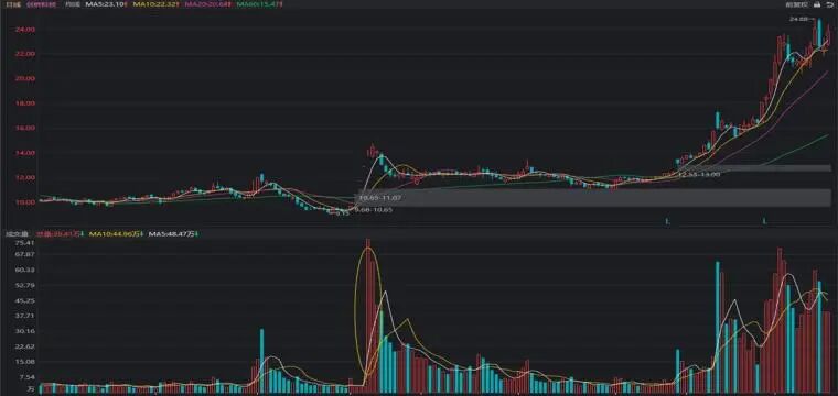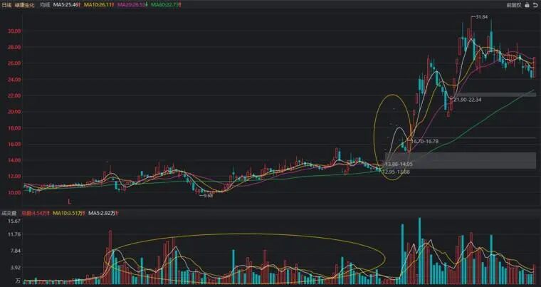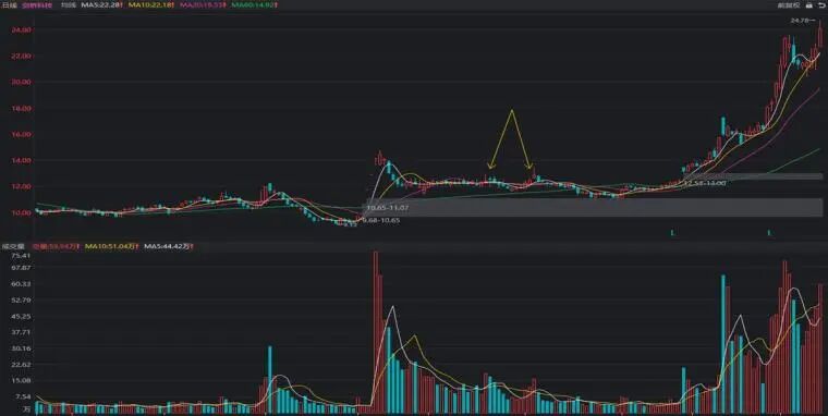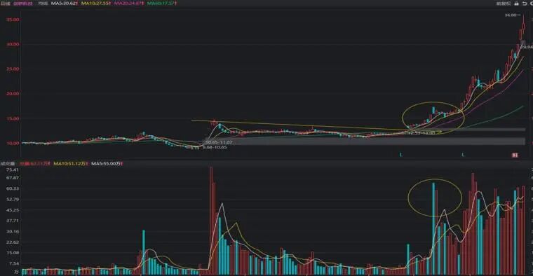 看上图,图中黄色圈圈处可以理解为主力资金的首次大规模建仓。特征突然爆巨量,然后成交量快速萎缩。有的朋友可能会问,这里怎么确定是建仓还是出货呢?答案是不需要确认,等待确认就可以。什么时候股价突破这个高点或者高点附近,什么时候再介入。否则看都不用看。![]()
