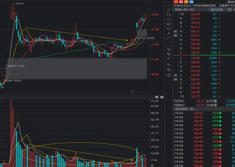 主升:看上图,上图为剑桥科技的主升阶段,看成交量是不是红肥绿瘦。这里说明了什么?说明了主力没有出货,股价大概率就还有上涨的空间。为什么是大概率,不是一定?千万不要以为主力资金运作一个股票一定是赚钱出来的,我们可以看到做超短的游资是经常会亏损的,即使是养家老师、上塘路老师,全国最牛的顶级游资也会亏损。那么同理,庄家也是会亏损的。没有谁能操作每一个股票都赚钱。这是最简单的常识。看到昨天又个人在论术“中船科技”亏损那个帖子下留言,就这还教别人?论术直接拉黑了,拉黑了不算完啊,文章里还得点评一下,既然是小学生,为什么要来大人的世界里捣乱呢?为什么不回学校去学呢?这样是没有前途的。