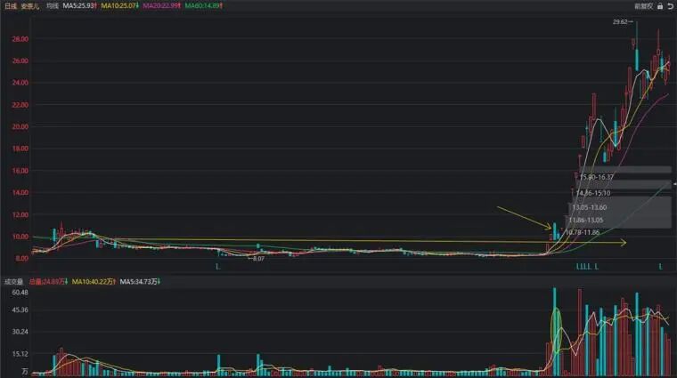 看上图成交量,有明显的主力运作痕迹,股价一字板突破平台,结果一字