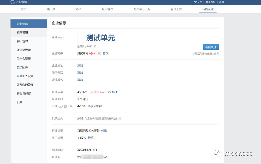 每隔企业都拥有唯一的corpid,获取此信息可在管理后台"我的企业"-"企业管理"下查看"企业ID"