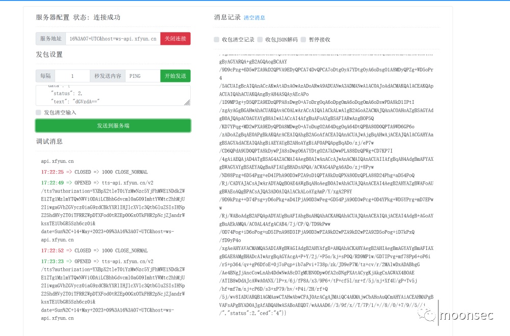 wss://tts-api.xfyun.cn/v2/tts?authorization=YXBpX2tleT0iYzMxxxxxxxxxxxxxxxxxxxRlIHJlcXVlc3QtbGluZSIsIH************************NcjZJandrWksxTE1UbGR5Szh6cz0i&date=Sun%2C+14+May+2023+09%3A16%3A07+UTC&host=ws-api.xfyun.cnPOST请求参数, 文本内容,需进行base64编码。app_id需要修改