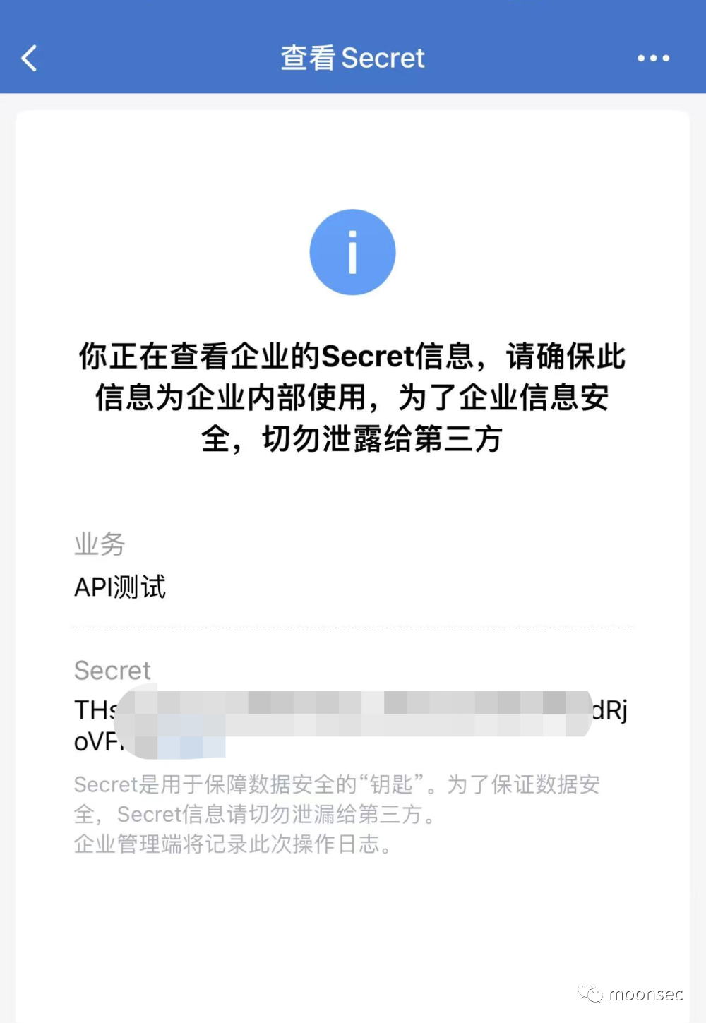 secret是企业应用里面用于保障数据安全的"钥匙",每一个应用都有一个独立的访问密钥,为了保证数据的安全,secret务必不能泄露。查看Secret需要在手机企业微信查看
