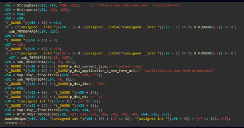 让我们从sub_70FD611C0C开始检查这些函数。简要概述显示,当与C&C服务器通信时,此函数打算使用路径为“/addcontent3”的HTTP POST方法来执行: