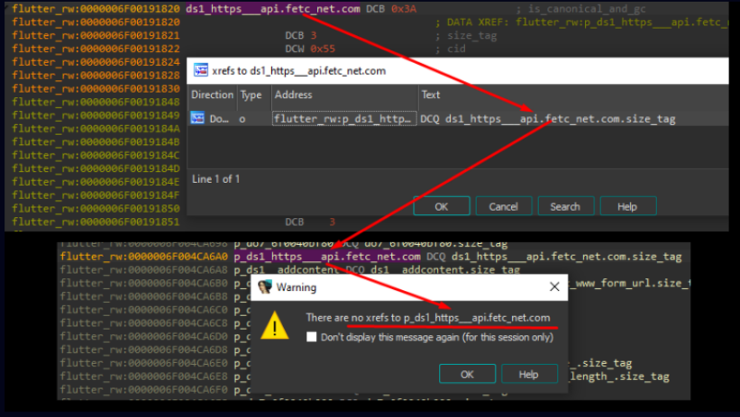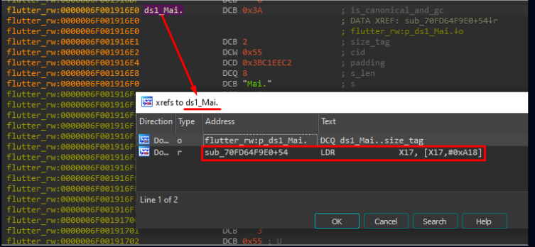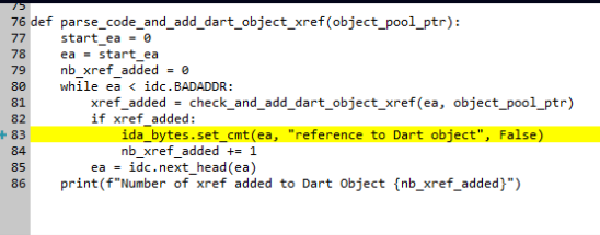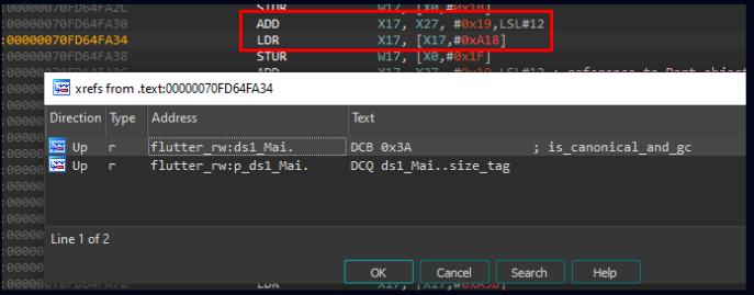 研究人员提到的存储库包含一个用于创建对Dart对象引用的脚本:add_xref_to_art_objects.py。当运行它时,该脚本会遍历代码并创建对create_Dart_objects.py脚本创建的Dart对象的引用。不过此时仍然只有一个对我们感兴趣的字符串的引用,即来自对象池的引用: