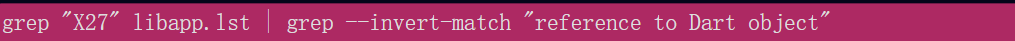 首先,grep查找具有X27的所有字符串。然后,所有这些字符串都给了第二个grep命令,只打印那些不包含对Dart对象引用的字符串。因此,我们只看到不受支持的X27引用。