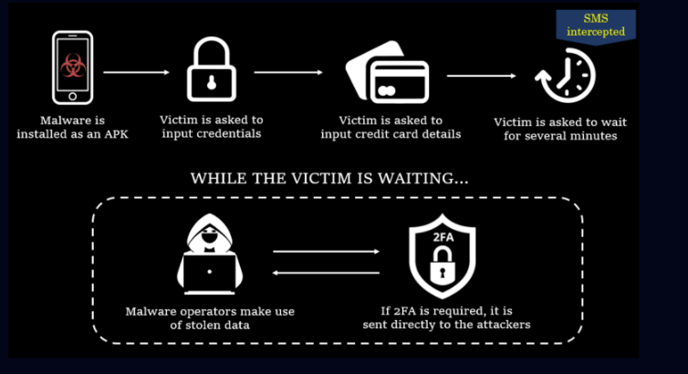 不管他们的意图是什么,这个计划都很有效。受害者输入敏感数据后,这些数据会被泄露到C&C服务器。与此同时,恶意软件要求受害者在“处理数据”时等待几分钟。在这一步中,短信拦截功能发挥作用,将所有传入的短信流量重定向到恶意服务器。如果攻击者输入被盗凭证或信用卡数据,然后被要求输入双因素身份验证(2FA)代码,这也会被拦截。网络钓鱼方案如下: