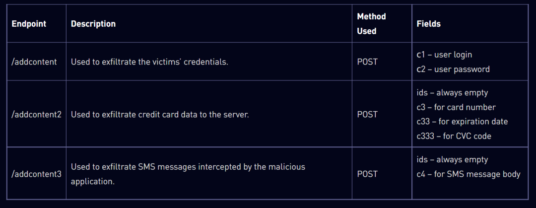 C&C协议旨在将数据从受攻击设备发送到服务器。没有命令可以在相反的方向上发送,即从服务器发送到受攻击设备。HTTPS用于传输数据,并且使用了几个终端。