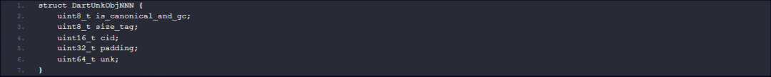 在Flutter应用程序逆向工程时,研究人员注意到最后一个字段(unk)经常被用作指针。可以考虑将该字段从简单的QWORD转换为OFFSET QWORD。这可能会给带来一些误报,但也可能非常有助于创建参考。因此,我们决定更改由脚本创建的unkin结构的字段类型。以下是对原始脚本的更改: