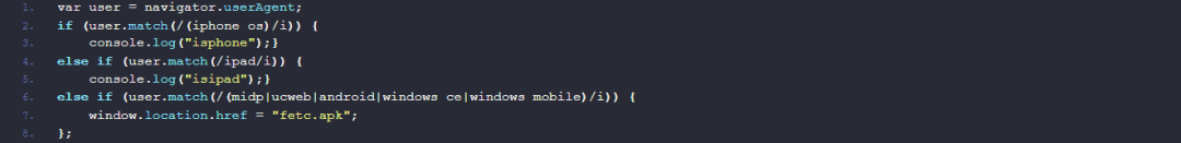 在这个恶意网站上,攻击者添加了一个额外的保护层,以确保只有受害者才能下载APK:如果目标的用户代理与预期的用户代理匹配,就会下载APK。此检查是通过客户端JavaScript执行的: