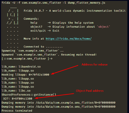 flutter-re-demo使用Frida收集内存转储并获取对象池地址。如果我们使用在flutter-re-demo存储库中可用的dump_flutter_memory.js脚本运行APK,我们会看到所需的地址: