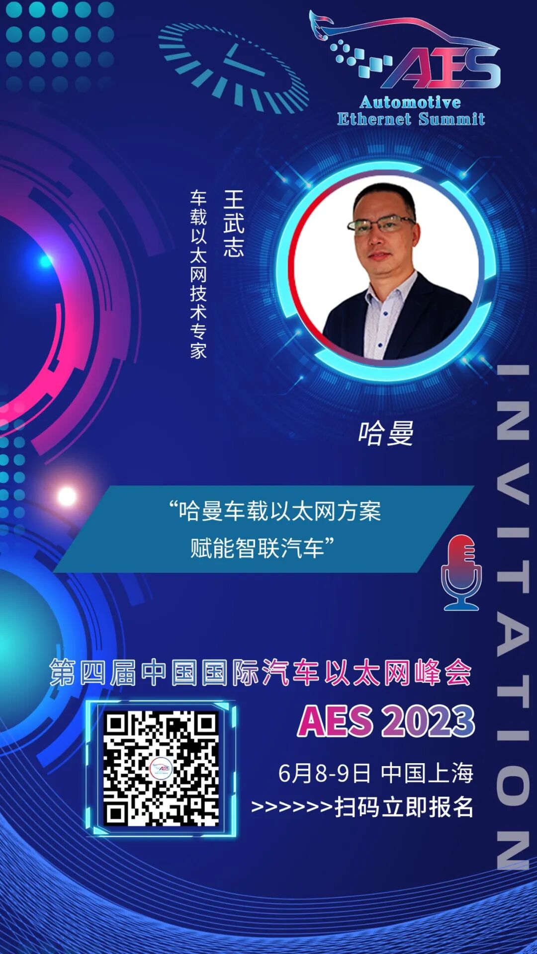 此次,哈曼车载以太网技术专家王武志,将在AES 2023上分享“ 哈曼车载以太网方案赋能智联汽车 ”的精彩话题。
