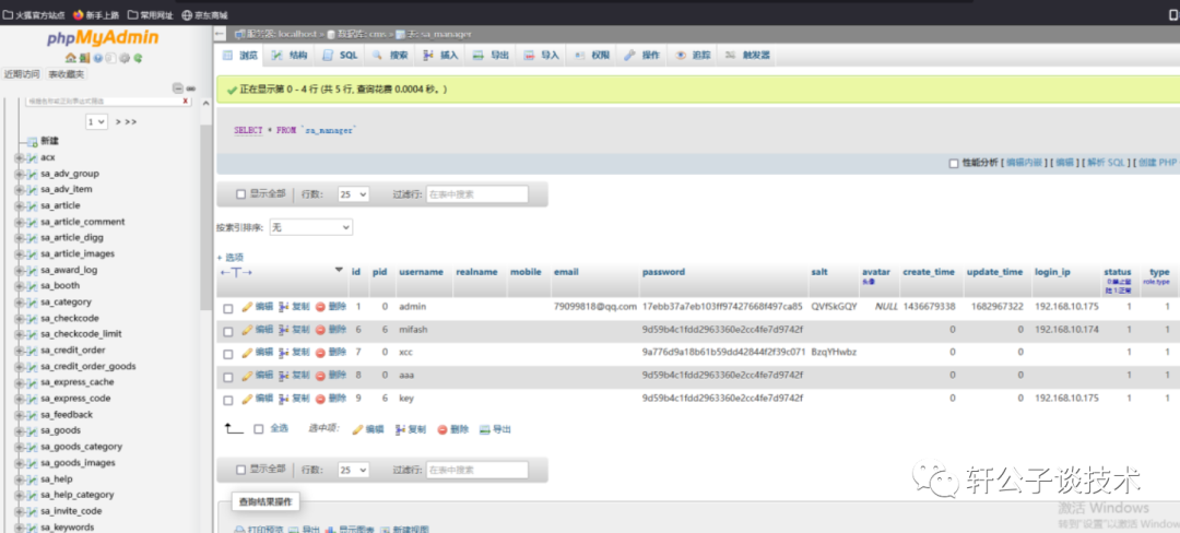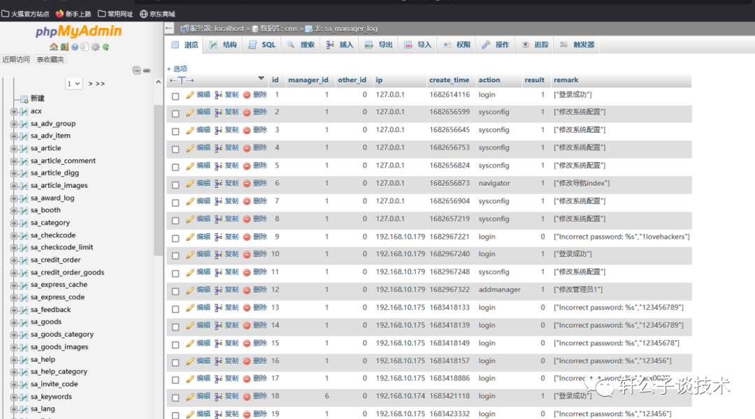 最后发现无法通过常见phpmyadmin写shell方法写shell,查找后台密码发现sa_manager_log里面存在明文密码直接登陆,账号admin密码1lovehackers:
