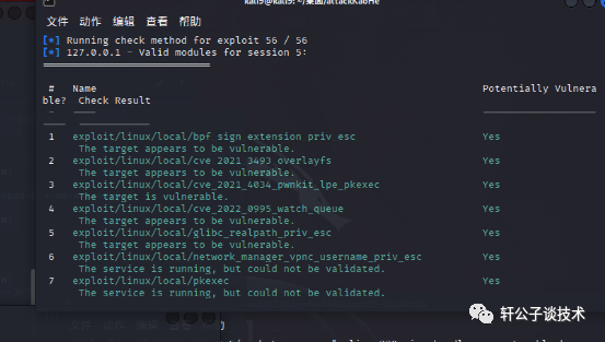 使用run post/multi/recon/local_exploit_suggester模块查询: