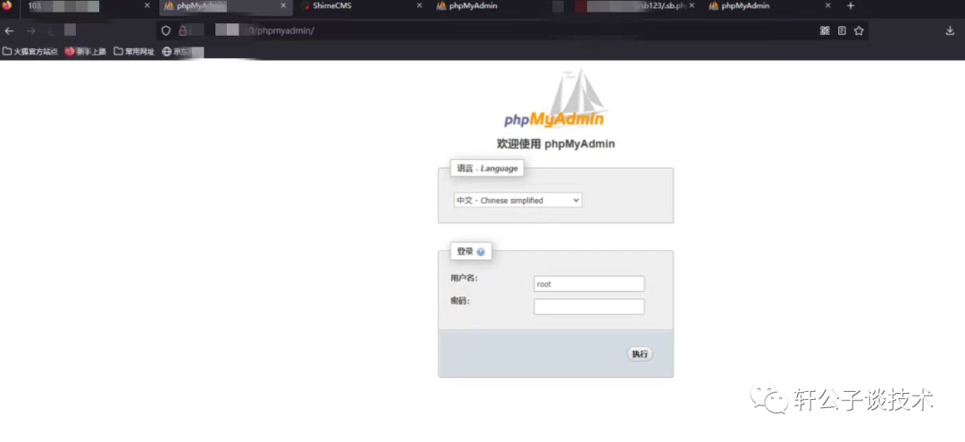 访问80端口发现目标为shirnecms,同时还有个phpmyadmin: