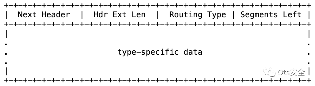 IPv6 具有可选扩展标头的概念,其中包含有关数据包、数据包配置方式以及需要转到的位置的信息。一类标头是路由标头,它允许数据包列出数据包应通过的一系列 IPv6 设备。路由标头的基本结构如下所示: