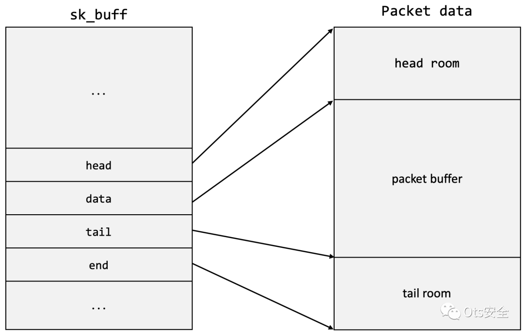 Linux 内核在称为sk_buff(套接字缓冲区)的结构中处理网络数据。该结构包含大量信息,但重要成员如下: