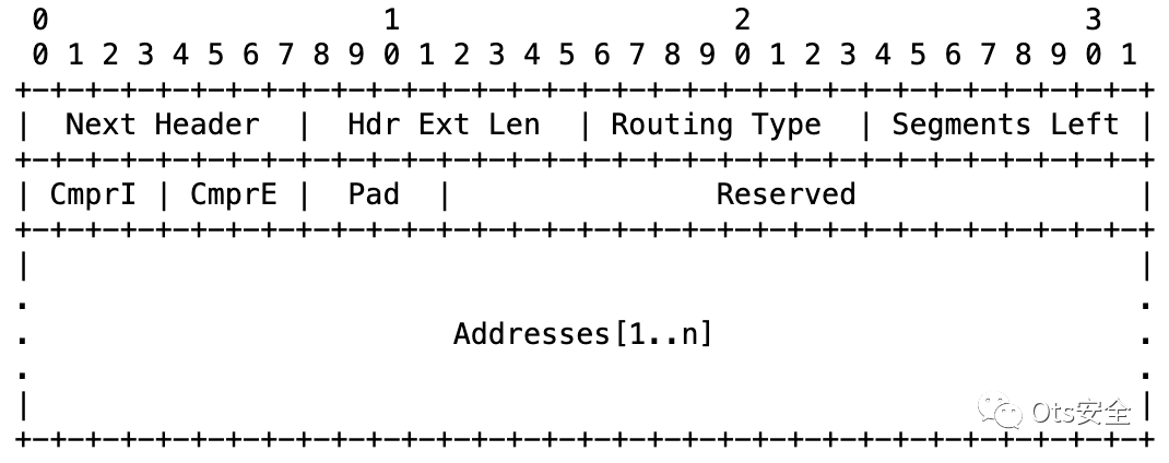 如果我的 CmprI 值为 15(因此向量中的每个地址将只包含一个字节),但 CmprE 值为 0(因此向量中的最终地址包含完整的 16 个字节), 然后,当向量中的最终地址成为目标地址时(就像segments_left == 1时发生的那样),可能无法重新压缩所有地址。