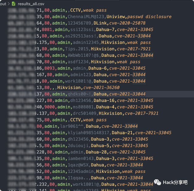 ip,端口,设备类型,用户名,密码,漏洞条目not_vulnerable.csv 中保存的是没有暴露的设备