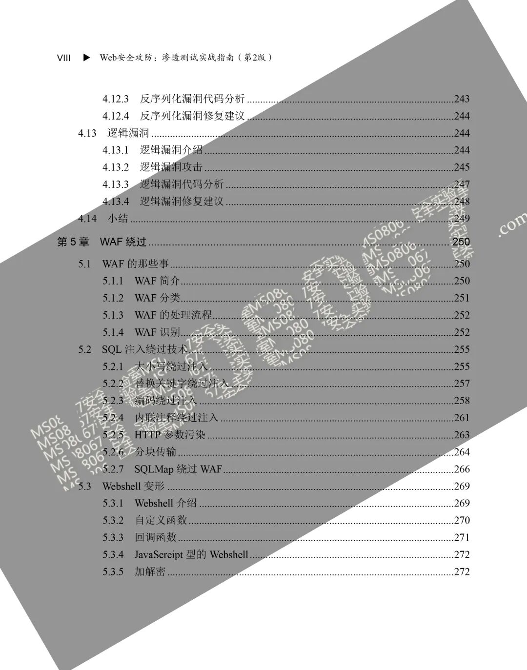在日常渗透测试工作中,经常会遇到WAF的拦截,特别是在SQL注入、RCE、文件上传等测试中,给渗透工作带来很大的困难。本章详细介绍了WAF的基本概念、分类、工作流程和如何识别,着重讲解了在SQL注入和文件上传漏洞等场景下如何绕过WAF以及Webshell的变形方式。未知攻,焉知防。只有知道了WAF的“缺陷”,才能更好地去修复漏洞和加固WAF。