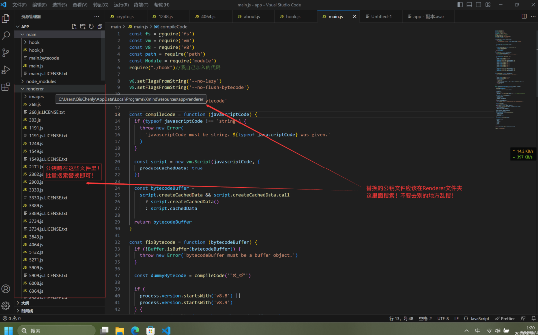还有,如果搜索结果搜索不到这串公钥说明你搜索范围有问题,我要你搜索的是 main文件夹同级的renderer文件夹内的所有 js 文件,而且不要用 vscode 格式化 js 文件!这些 js 文件应该是压缩好的,格式化js文件后会搜索不到!!