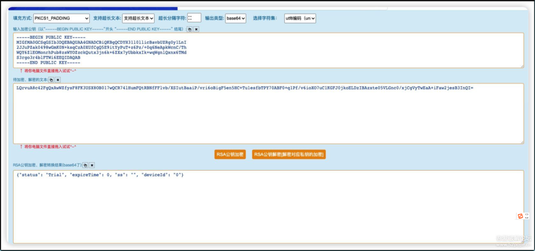 -----BEGIN PUBLIC KEY-----\nMIGfMA0GCSqGSIb3DQEBAQUAA4GNADCBiQKBgQCDYH31l0llicBavbUZRg0y1LnI\n2JJuPZak0498wGmK0N+ksqCzA0XUfCgQ5E9itYyPuT+z6Pz/+0q6NeApkWcnC/Th\nWQY6ZlEOMonrhPub8zsWYOZzckQutx3jn6k+6ZXx7yUbbkxIk+wqWgnlQxnx6TMd\nS3rgo3r4blFTWi6EEQIDAQAB\n-----END PUBLIC KEY-----由此可见,这是一个 RSA 公钥,然后我们用他解密我们的e.rawSubscriptionData 试试。