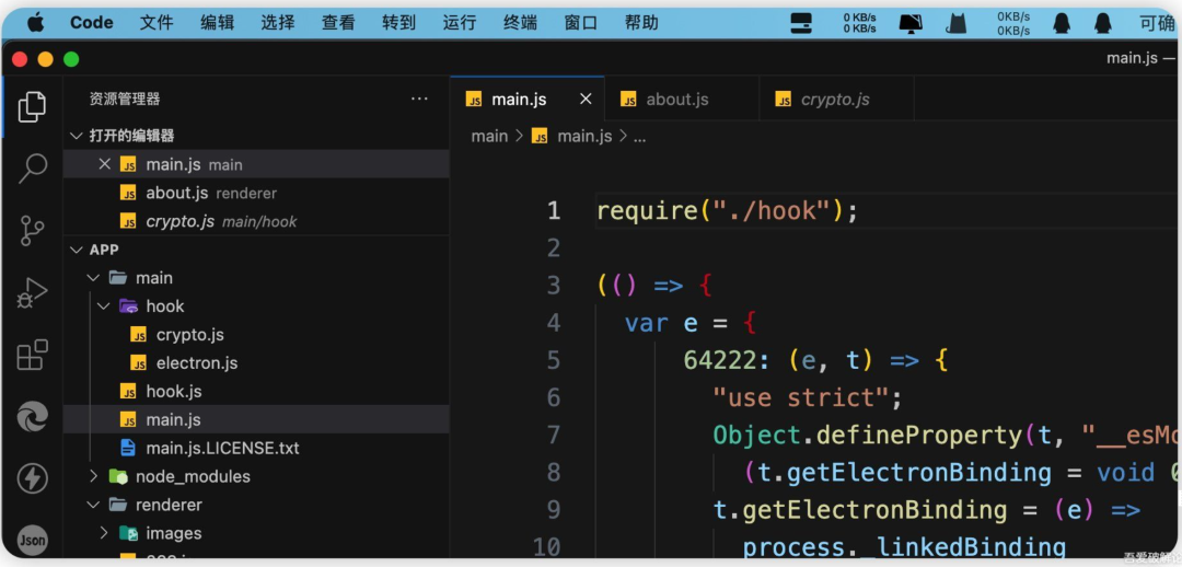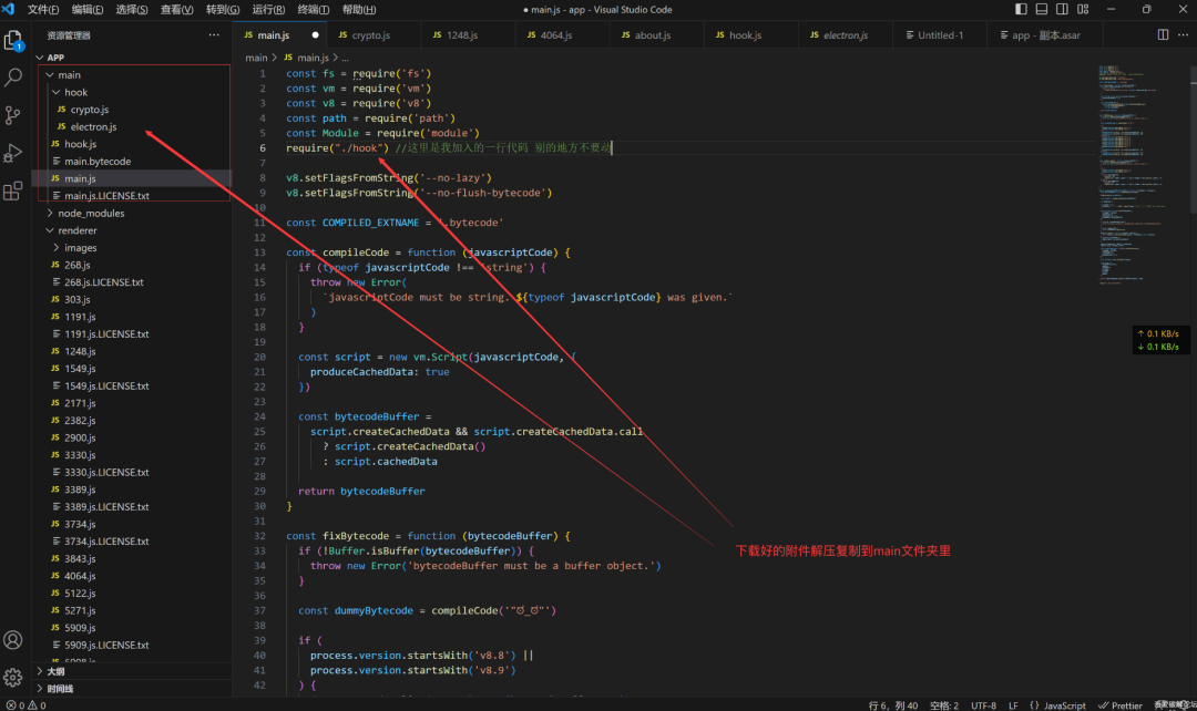 得到了 asar 解包后的文件,照旧将附件解压出来的hook.js文件和hook文件夹复制到asar文件解包出来的 main文件夹中