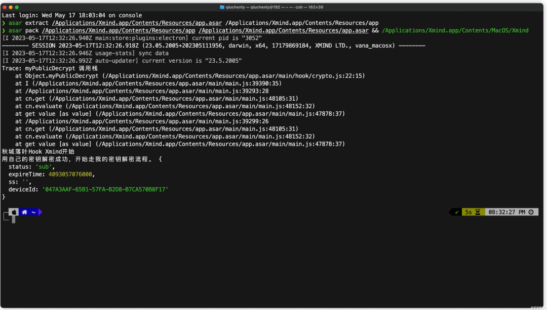 const crypto = require("crypto");// 保存原始的 publicDecrypt 函数const originalPublicDecrypt = crypto.publicDecrypt;const originalPublicDecryptEx = function (message) {let key = `-----BEGIN PUBLIC KEY-----\nMIGfMA0GCSqGSIb3DQEBAQUAA4GNADCBiQKBgQCDYH31l0llicBavbUZRg0y1LnI\n2JJuPZak0498wGmK0N+ksqCzA0XUfCgQ5E9itYyPuT+z6Pz/+0q6NeApkWcnC/Th\nWQY6ZlEOMonrhPub8zsWYOZzckQutx3jn6k+6ZXx7yUbbkxIk+wqWgnlQxnx6TMd\nS3rgo3r4blFTWi6EEQIDAQAB\n-----END PUBLIC KEY-----`;const n = originalPublicDecrypt({key: key,padding: 1,},message);return n;};// 将 publicDecrypt 函数定义为 getter 方法,返回新的实现Object.defineProperty(crypto, "publicDecrypt", {get() {return function myPublicDecrypt(...args) {console.trace("myPublicDecrypt 调用栈");console.log("秋城落叶Hook Xmind开始");args[0]["key"] ="-----BEGIN RSA PUBLIC KEY-----\nMIGJAoGBALuQXELwuGkDD+IYTrrSNgztWK6pdbM3bBDWVtQeP6oJWbY10PCP24Wy\nkxo/6nn0xRDFM4Y+QKMrztEb64JvpKxUI4QFnn67PDJtW3QnvvQNJKzO+xWFDNKZ\nwB5kPZ0WGROBgAWjp2/v6hUN/1+JWoIwDilpa0LwHZ8OMvcyu/6lAgMBAAE=\n-----END RSA PUBLIC KEY-----";let result;try {result = originalPublicDecrypt.call(this, ...args);let data = JSON.parse(result.toString());data.status = "sub";data.expireTime = 4093057076000;result = Buffer.from(JSON.stringify(data));crypto.log("用自己的密钥解密成功,开始走我的密钥解密流程。", data);} catch (e) {crypto.log("解密出错,开始走官方密钥解密流程。");result = null;let ori = originalPublicDecryptEx(args[1]);crypto.log("解密出错",args[1].toString("base64"),"\n官方密钥解密结果",ori,"\n错误细节\n",e);result = ori;}// 调用原始的 publicDecrypt 函数return result;};},});Object.defineProperty(crypto, "log", {get() {return function log(...args) {console.log(...args);};},});module.exports = crypto;