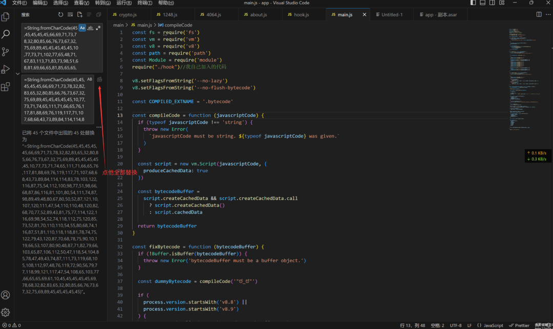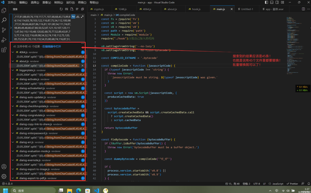 接下来Sublime Text/VSCode 搜索替换所有js里面的的公钥为我的 RSA 公钥,具体操作和替换的代码在上面有,仔细查看。全部替换并保存所有文件后并打包回 app.asar就完成了!