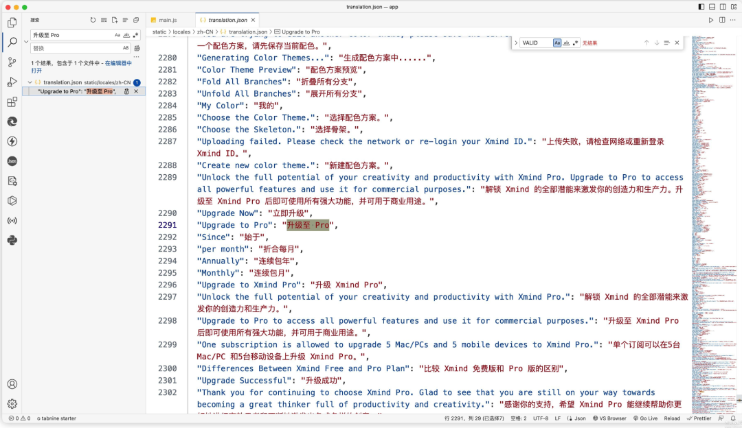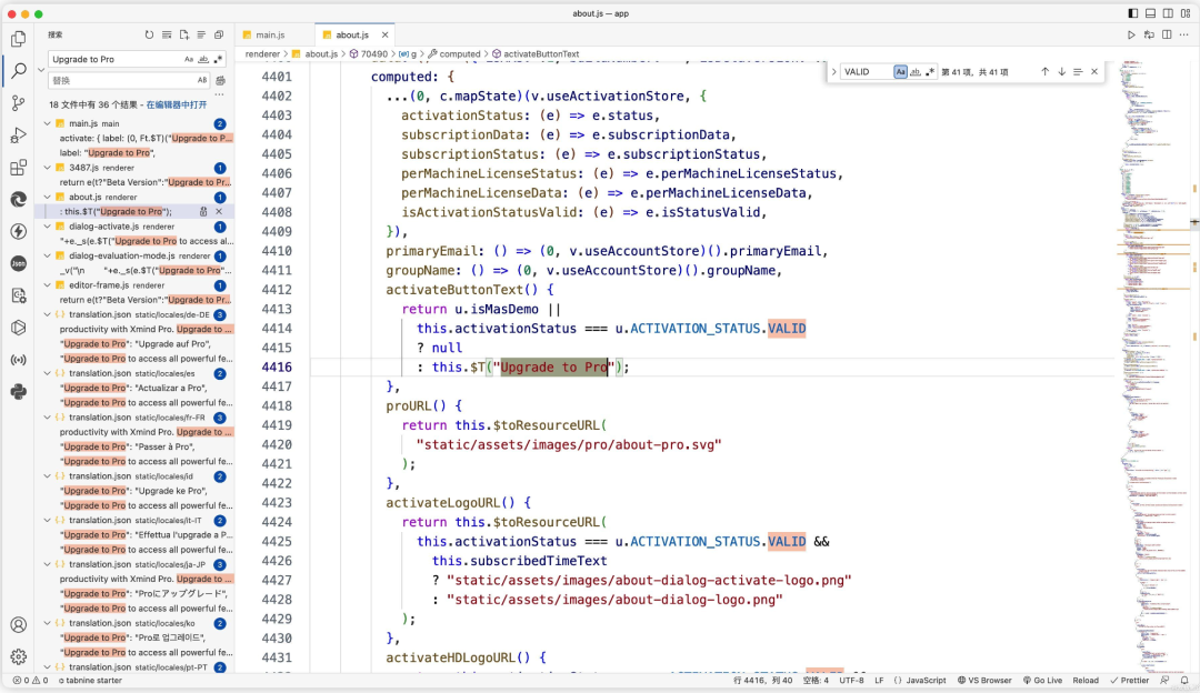 经过进一步的搜索,发现 Xmind 4412 行代码中认为this.activationStatus === u.ACTIVATION_STATUS.VALID 表示激活,否则显示激活按钮。