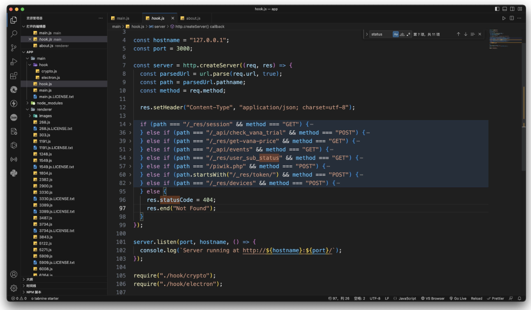 随后少年用 Visual Studio Code 打开 app 文件夹,开始查阅反编译的代码.