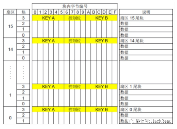例如这种16扇区,64扇块的M1卡,内部的数据存储形式是这样的