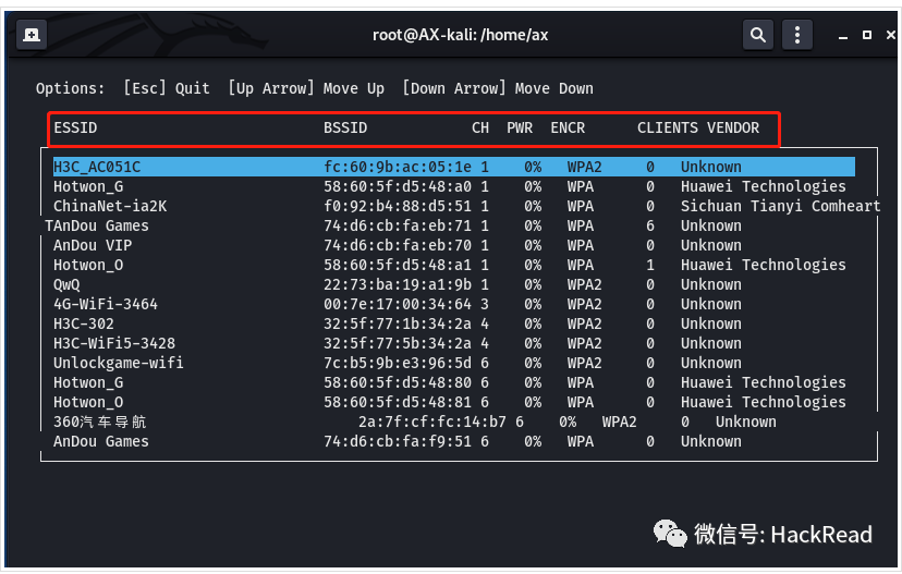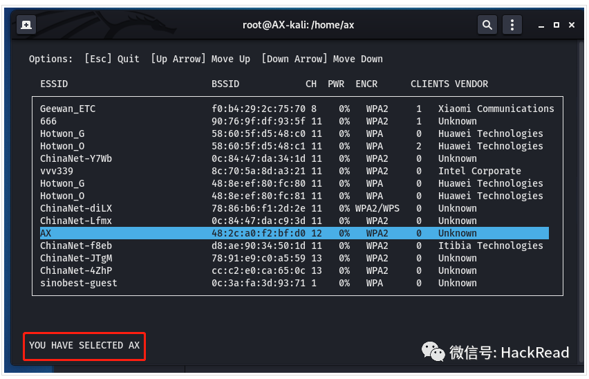 然后使用鼠标滚轮或者小键盘的方向键,上上下下寻找你要攻击的wifi,这里我们继续选择AX这个wifi,回车确定就会出现you have selected AX