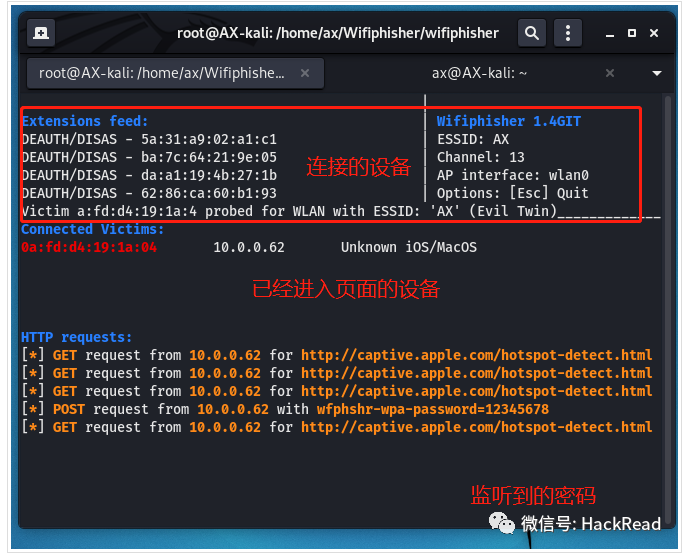 然后就会跳转到这个页面下,显示已经连接的用户,已经进入钓鱼页面的用户还有监听到的密码数据