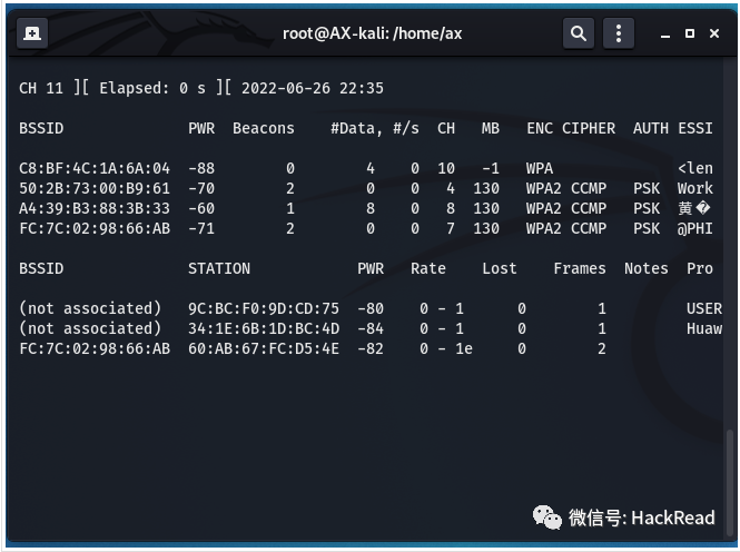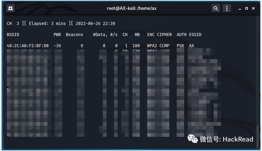 此时已经开启了网卡的监控,可以开始扫描现场存在的wifi了