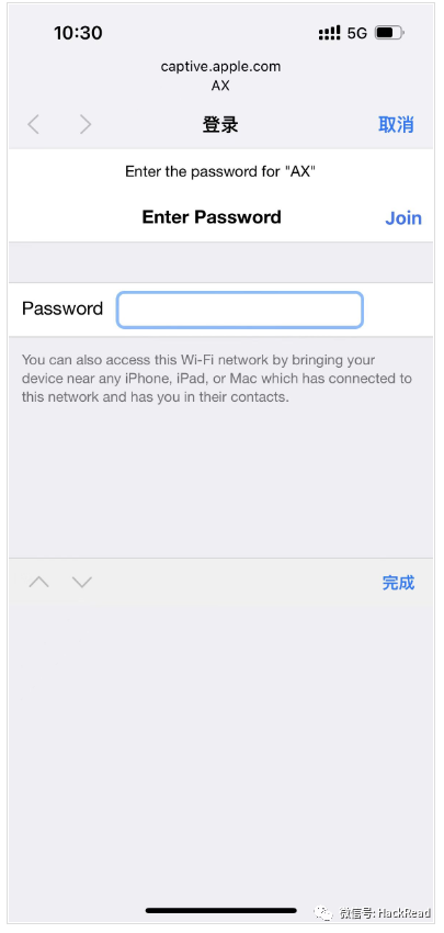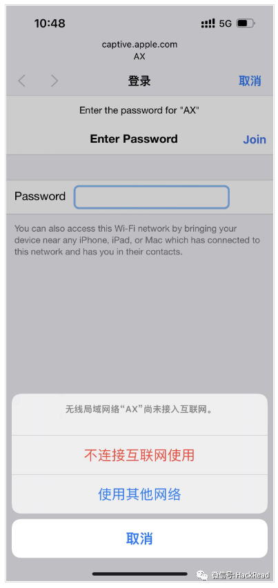 接着当用户输入密码进行验证之后,我们就得到了原来wifi的密码了,又一次顺利进入内网😏如果他不信这个,点击了取消的话,页面就会提示这个无线局域网尚未接入互联网,可以说是很逼真了,对付一般的工作人员还是有用的,而且对于政府部门,医院这种,你自己发射个wifi信号出去,能够钓到人,但没准是来办业务的人呢?你监听不到什么有用的数据,所以这种方式会更加有优势一点。