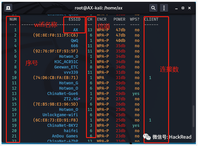 接着就会进入监听状态,查看附近有什么信号源,跟其他的工具差不多,都会把信道,连接数量显示出来,这里尽量选择已经有连接的wifi,不然没人连接的得等到啥时候