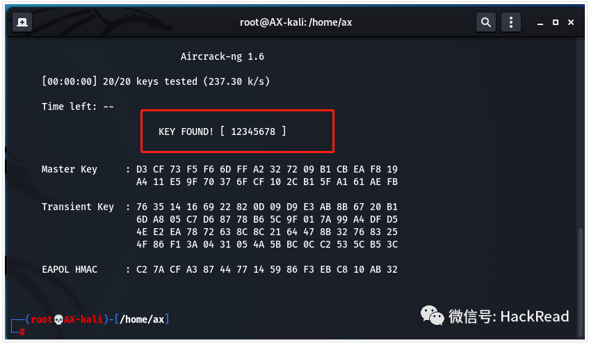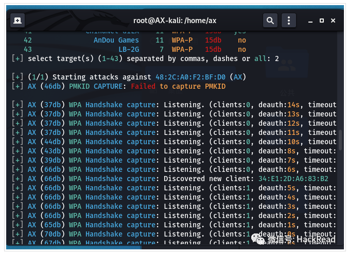 如果没捕获到PMKID,就会提示PMKID CAPTURE: Failed to capture PMKID,然后进行数据包的监听,当有用户连接进来的时候就会产生握手包,然后去跑字典。