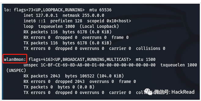 如果一切正常,检测到了网卡的存在,接着开启下网卡的监控,不开启的话是没办法进行监听的,有一些工具开启之后会帮你打开这个东西