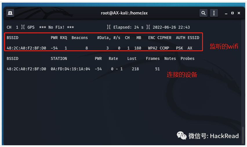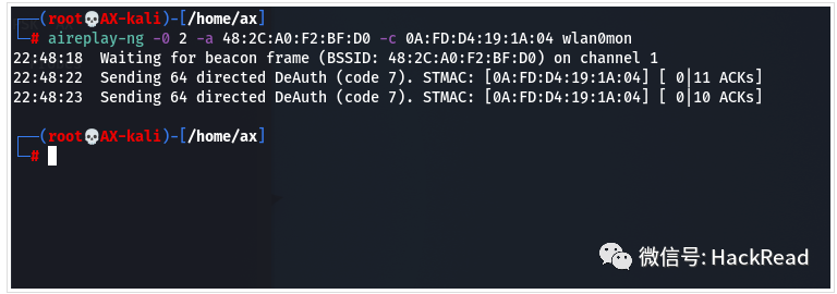 如果没连接的设备,就没办法接着往下的步骤了,所以这块还是比较看缘分的,从数据中看出有一台设备在连接,然后接着把这个用户踢下线,然后监听他重新连接的握手包,运行以下命令