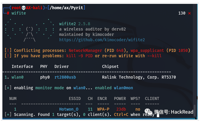 开启wifite,直接kali输入wifite就能启动然后开始监听(如果你插了网卡的话)