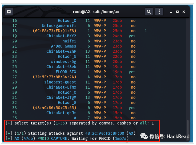 这里我们选择AX的wifi,然后开始捕获PMKID,是几年前比较新的一种用来破解无线密码的WPA/WPA2协议密码的方法,在之前的那些方法中,攻击者需要捕获用户连接路由器时的完整握手包。而新的方法可以在没有客户端的情况下,向AP发送请求来获取PMKID以用于破解,而且在研究员的文章中表示该攻击适用于所有支持并开启漫游功能(Roaming)的无线网络,具体不清楚到底会对多少路由器有效。